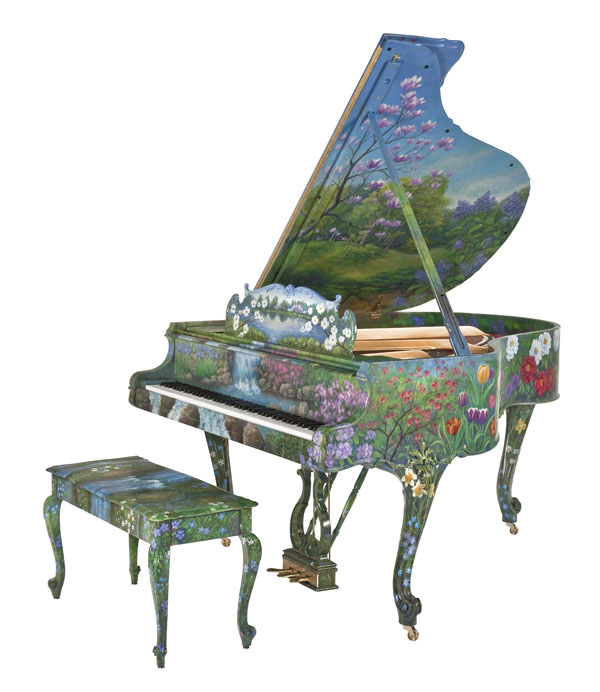 春天是最富艺术气息的诗意时节。当凋零的冬季渐渐远离,柔风细雨中,山峦河谷仿佛一夜间换上绿装,这神奇一幕,向来是艺术家们乐于歌颂的。不断追求创新的施坦威钢琴,自然不会错过“春”这一恒久母题。在春意盎然的季节,施坦威公司邀请美国艺术家瑞克•穆托(Rick Muto)设计了“春日时光”艺术外壳钢琴。以路易十五风格的M型三角钢琴为载体,画家花费了整整一年时间手工绘制出伊甸园般美妙的春日图景:远处蓝天白云,近处流水潺潺,眼前草长莺飞。春色之绚烂,春声之和悦,精巧完美地融合于整架钢琴中。